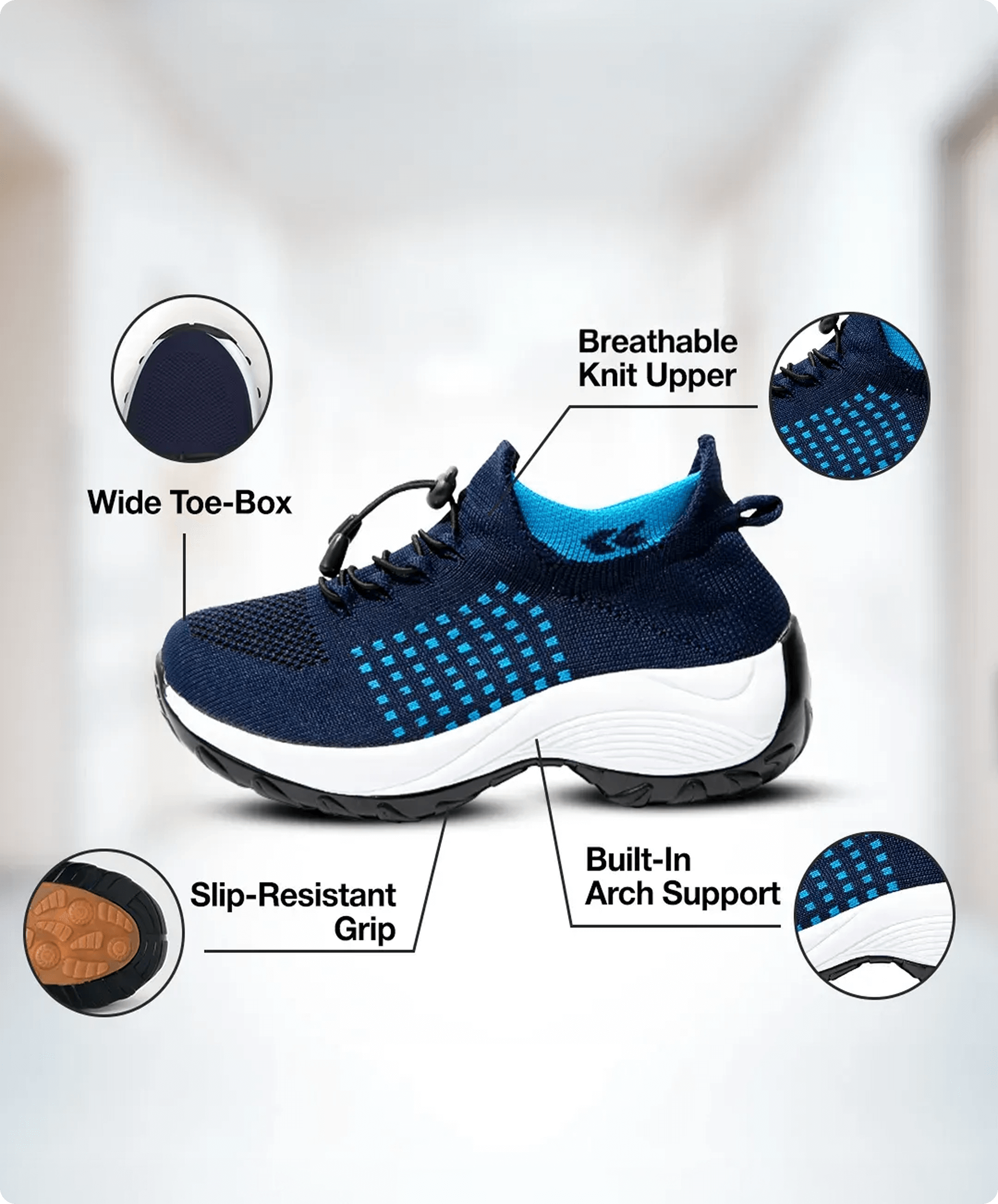 Built-in arch support helps realign flat feet, easing stress and improving posture.